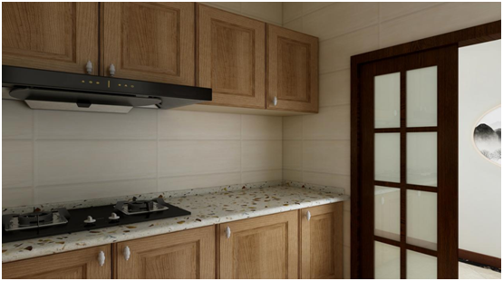 整體櫥柜實(shí)用為主,地面、墻面與頂面都以淺色調(diào)為主,搭配上深色櫥柜門(mén)板,顯得穩(wěn)重大氣。冰箱放到了廚房北側(cè)的陽(yáng)臺(tái)上,這樣就能在廚房做更多的櫥柜,地柜與吊柜都做成了滿L形,極大限度的利用了廚房的空間,拓展了其儲(chǔ)物功能。