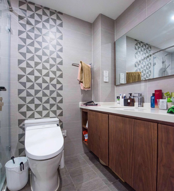 衛(wèi)生間的深淺搭配看起來很舒服,深色木質(zhì)浴室柜看起來更有質(zhì)感,淺色墻磚搭配深色腰線使整體空間更具層次感,坐便后面的背景設(shè)計(jì)使得整體空間看上去不再單調(diào)。整個(gè)衛(wèi)生間以業(yè)主的生活習(xí)慣為出發(fā)點(diǎn),簡(jiǎn)潔大氣并具有功能性。
