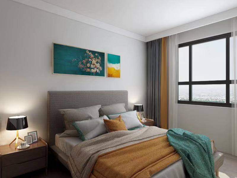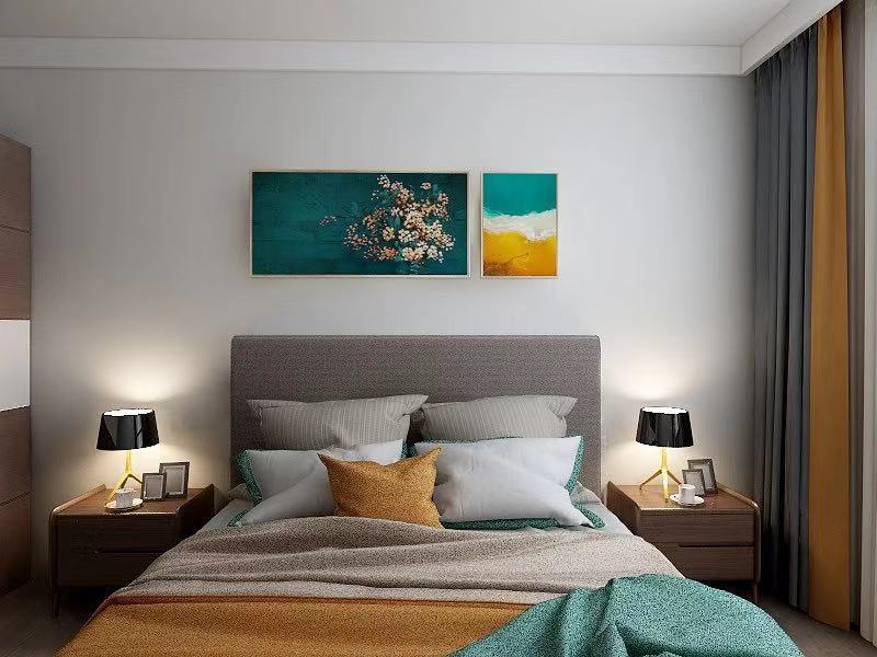 臥室以舒適為主,顏色不宜太暗,要避免使用大面積深色以防止悶重的感覺。所以在臥室的配色上用淺色調(diào)來進行調(diào)和。床頭上配簡單裝飾畫來點綴