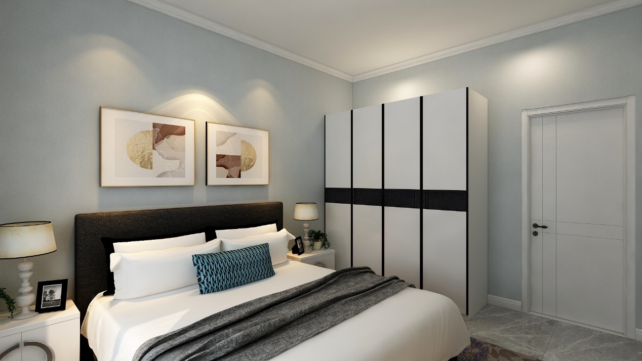 在臥室的設(shè)計(jì)上,要追求的是功能與形式的完美統(tǒng)一,優(yōu)雅獨(dú)特,簡(jiǎn)潔明快的設(shè)計(jì)風(fēng)格。頂部是白色墻漆,墻面上是和客廳統(tǒng)一的淡藍(lán)色的墻漆,淺色的家具上深色的裝飾線條,使得整體設(shè)計(jì)簡(jiǎn)單又帶有活力。在臥室設(shè)計(jì)的審美上,追求時(shí)尚而不浮躁,莊重典雅而不乏輕松浪漫的感覺。因此,在臥室的設(shè)計(jì)上,會(huì)更多的運(yùn)用豐富的表現(xiàn)手法,使臥室看似簡(jiǎn)單,實(shí)則韻味無窮