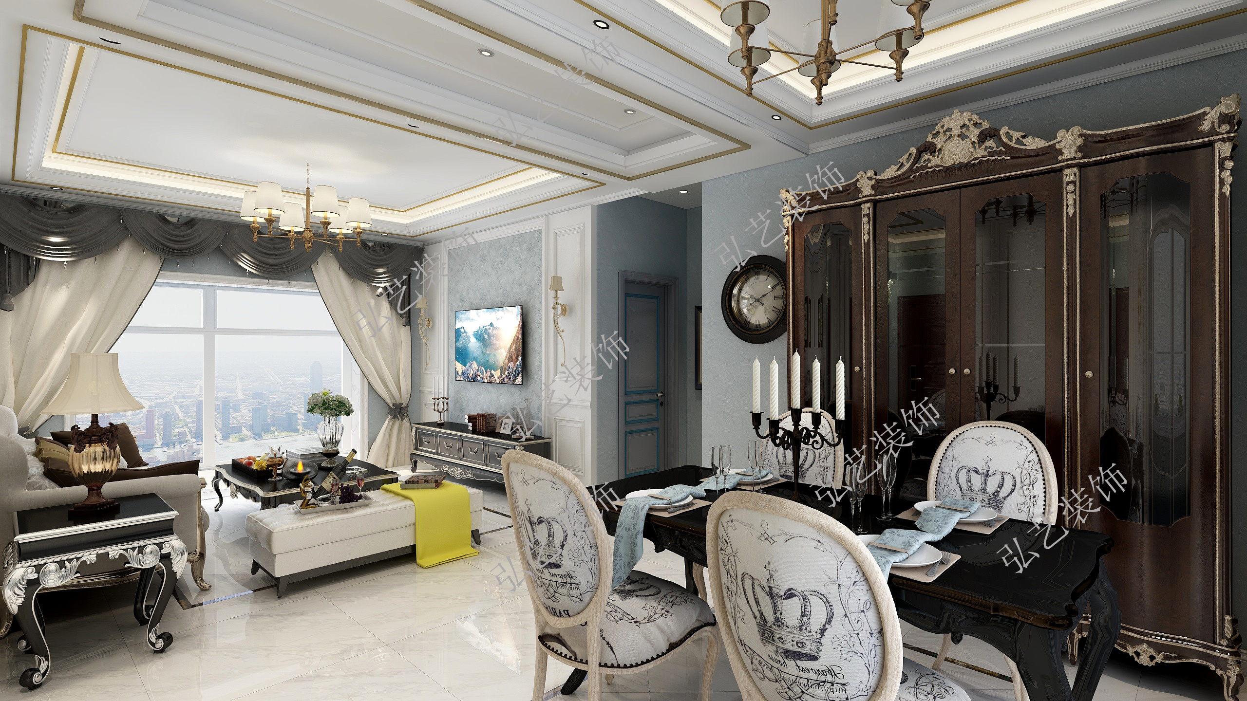 本案中運(yùn)用簡歐主義的空間語言,通過溫婉典雅、簡約輕奢的現(xiàn)代設(shè)計(jì)手法與元素運(yùn)用,呈現(xiàn)出當(dāng)代語境下融合的審美情趣,在塑造了低調(diào)奢華的家居環(huán)境下,將中西元素完美混搭于空間中,達(dá)到奢而不華、簡而不凡的理念。