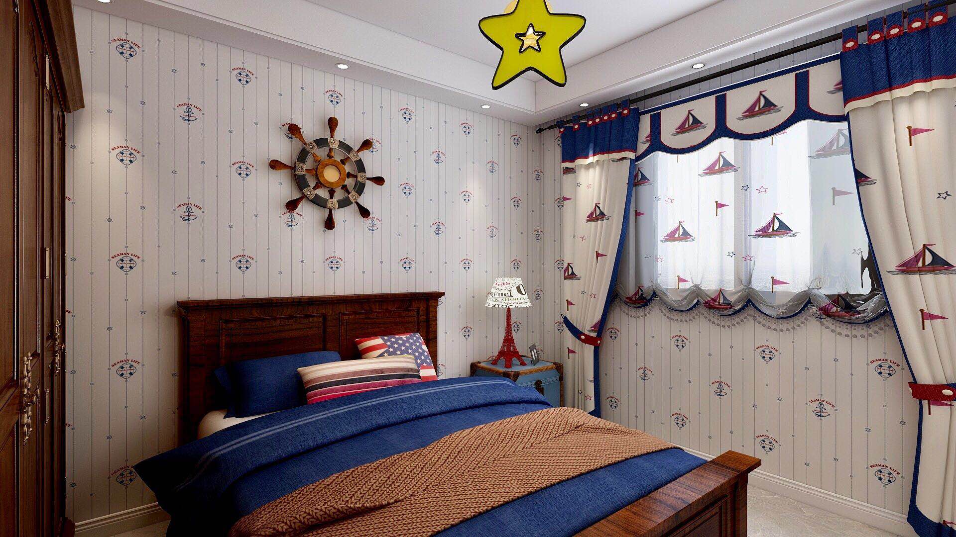 次臥室為兒童房,主人孩子現在還比較小,整體色調以藍色為主,整體清新自然,次臥選用了一個非常有趣的壁紙運用了很多的復古元素,打造了一個溫馨且有層次感的臥室空間,整體沒有過多的復雜裝飾,為業(yè)主提供的簡單的睡眠空間。