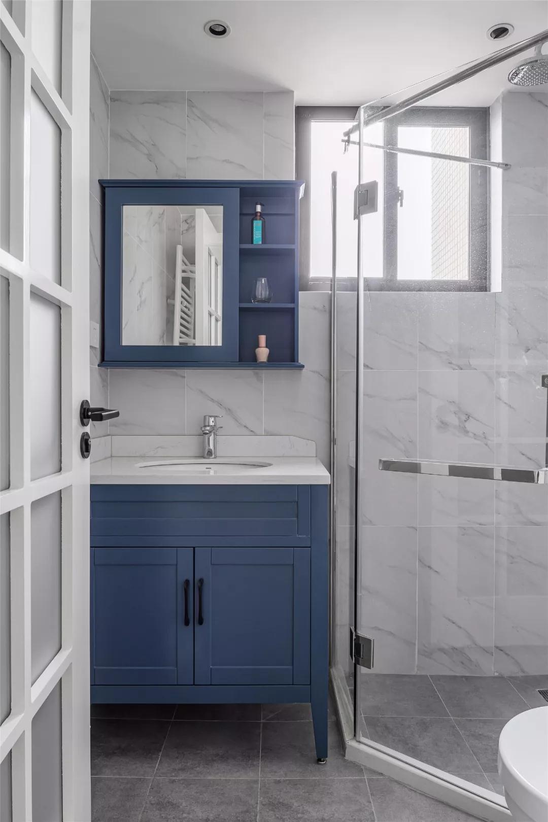 衛(wèi)生間,低飽和度的藏藍色浴室柜,搭配大理石紋路墻磚,簡約而清爽。