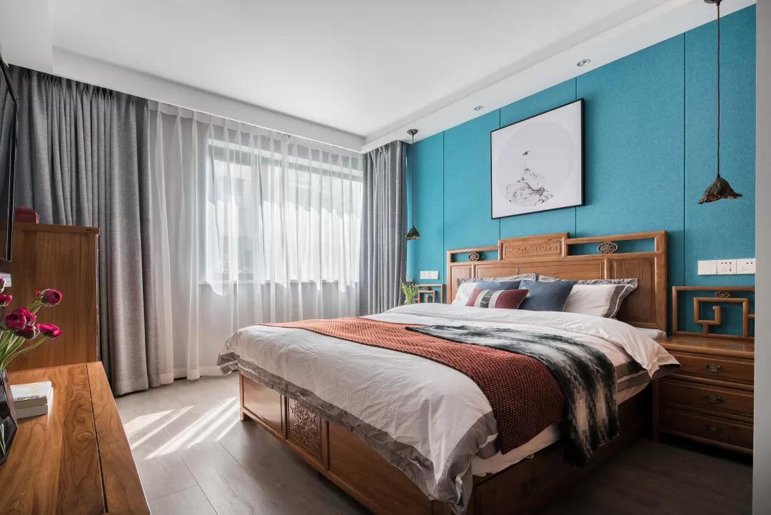床頭背景墻選用了神秘的湖藍(lán)色,可以給空間營造出輕松安適的氛圍。