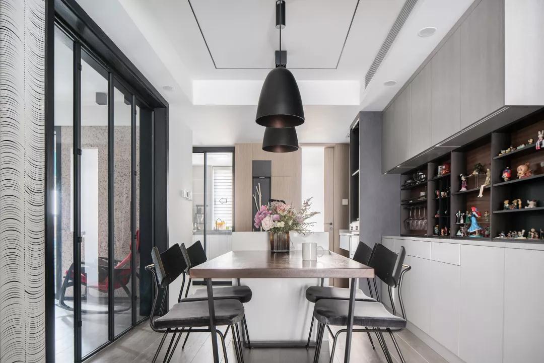 旁邊設(shè)計了一整面的餐邊柜,滿足儲物與展示的功能。
