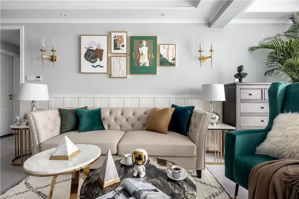 米白色皮質(zhì)沙發(fā)充滿質(zhì)感,沙發(fā)背景墻以銅質(zhì)壁燈與藝術掛畫裝點,展現(xiàn)出美式風格的奢華與典雅。