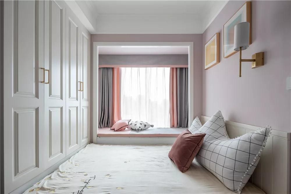 女兒房采用粉丁香色為主調(diào),溫馨而浪漫。墻面做了粉灰兩色的拼色造型,粉色圓形小毯子柔軟而舒適,擺放可愛的玩偶以及有趣的書籍,甜美而不失精致感。