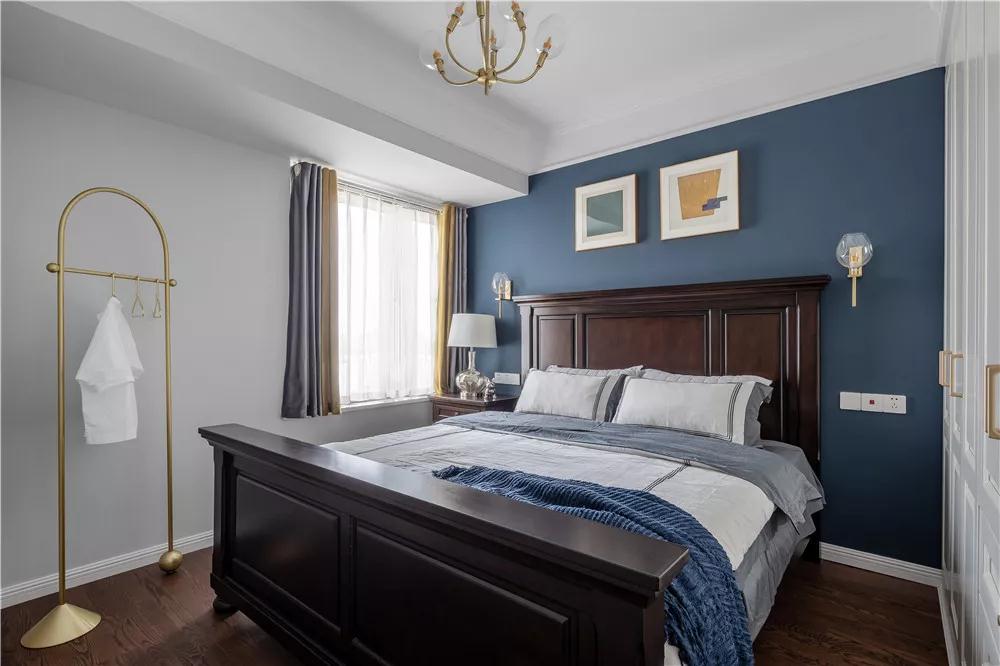 主臥墻面采用了深邃且靜謐的霧霾藍,輕奢落地轉(zhuǎn)角衣帽架,便于穿戴衣物的放置。