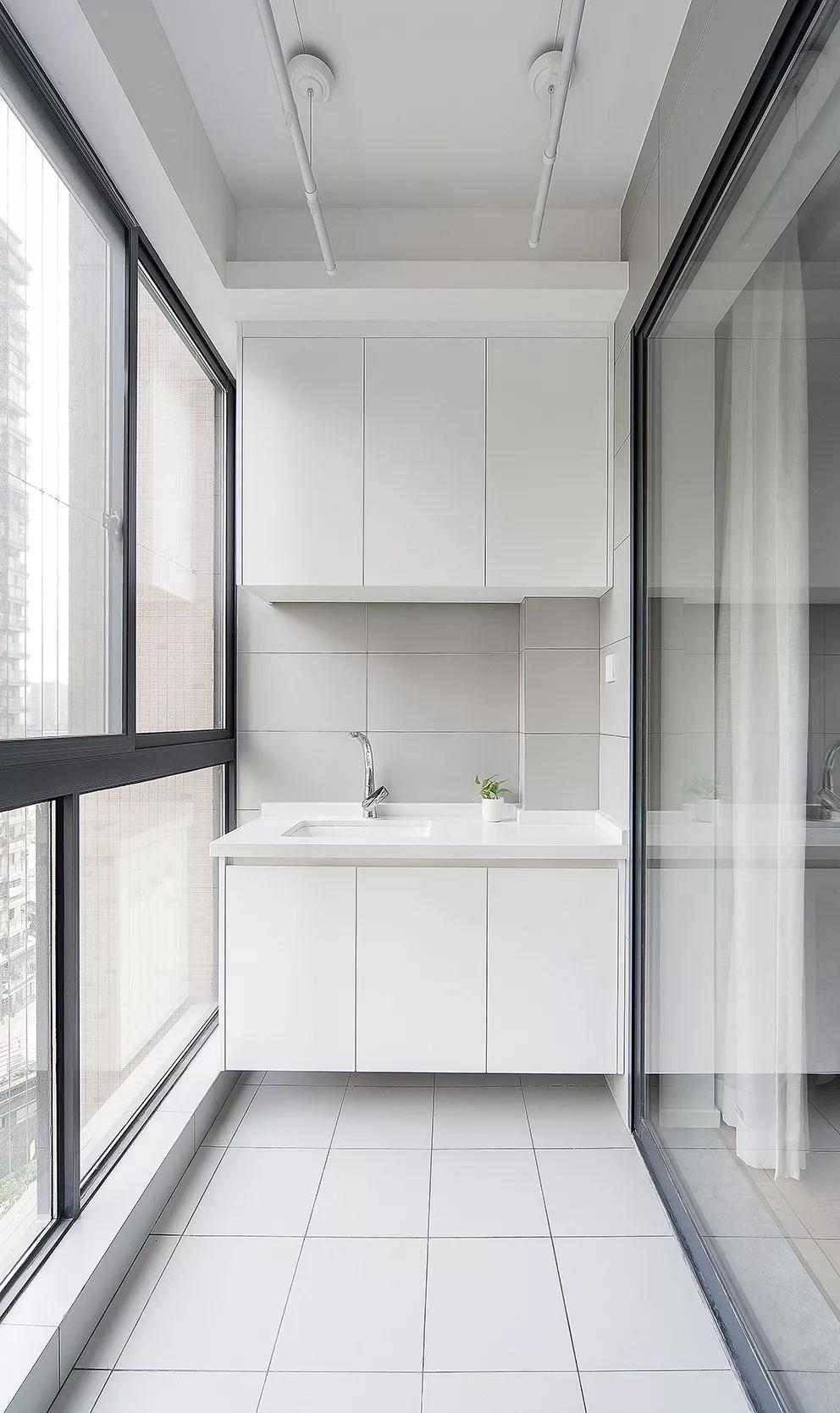 純色的素面磚鋪貼搭配白色的烤漆柜,讓陽(yáng)臺(tái)看起來(lái)是那么的簡(jiǎn)單干凈。