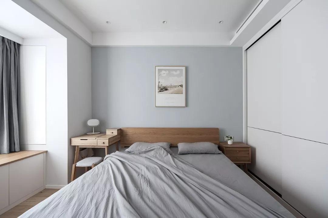 臥室采用冷靜而克制的灰藍(lán)色調(diào),木質(zhì)的清香深沉,在棉麻床品的柔軟中,對(duì)比出一種寧?kù)o致遠(yuǎn)的閑適。