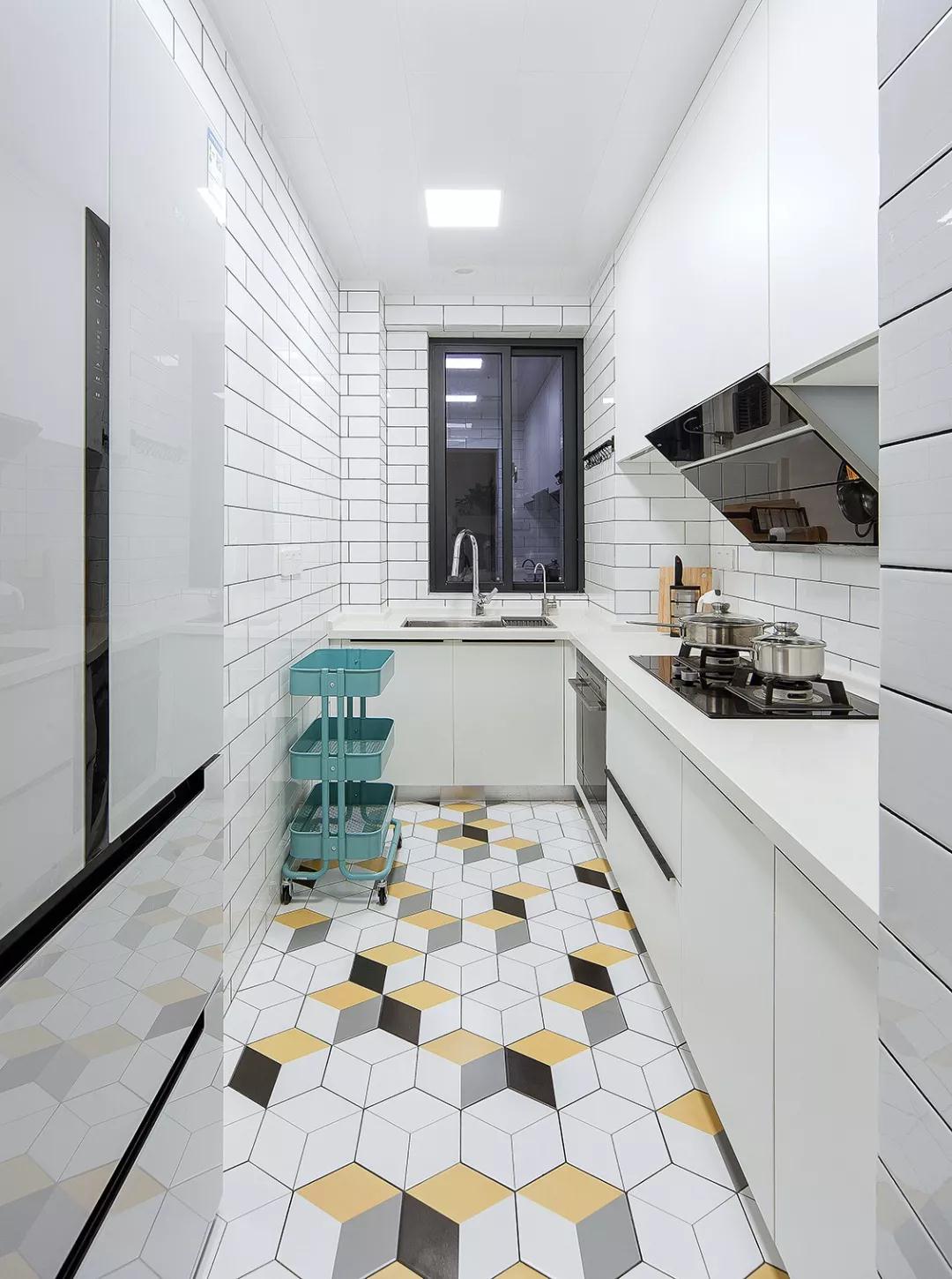 L型櫥柜合理做了廚房收納,白色與黃色的結(jié)合碰撞,構(gòu)造出一個(gè)純凈明亮的空間。