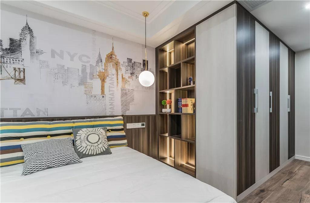 床頭墻張貼城市風(fēng)景的壁紙,配合木質(zhì)護(hù)墻板,營(yíng)造了格外輕快舒適的視覺(jué)。