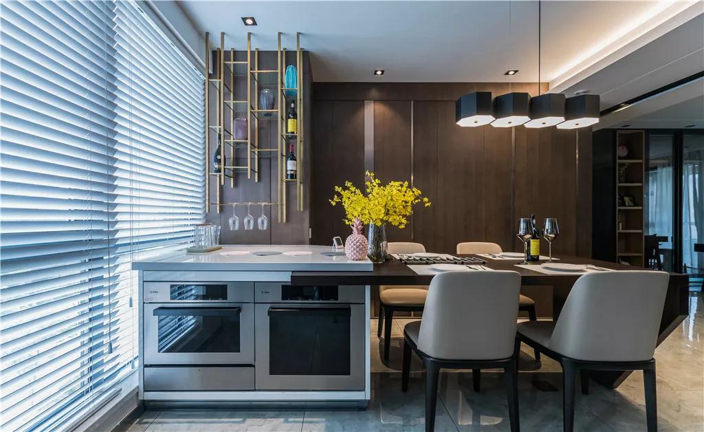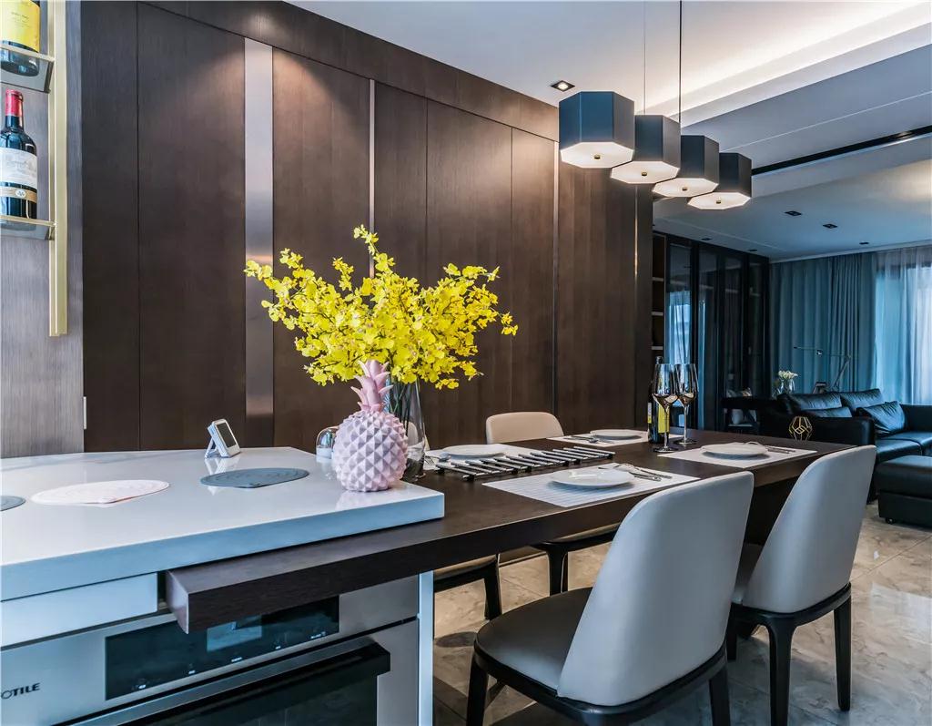 餐廳以深木色飾面板為大背景,吧臺(tái)式餐桌搭配灰色靠背的餐桌椅,配合六邊形的柱狀吊燈,烘托寫(xiě)意舒適的小資情調(diào)。