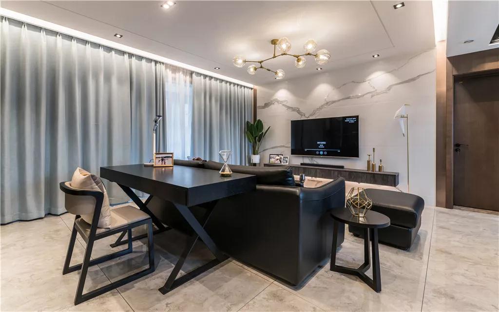 客廳與書(shū)房共享筒燈+樹(shù)枝吊燈的照明,沙發(fā)背靠書(shū)桌,與大理石質(zhì)感的電視墻相對(duì),也顯得落落大方。