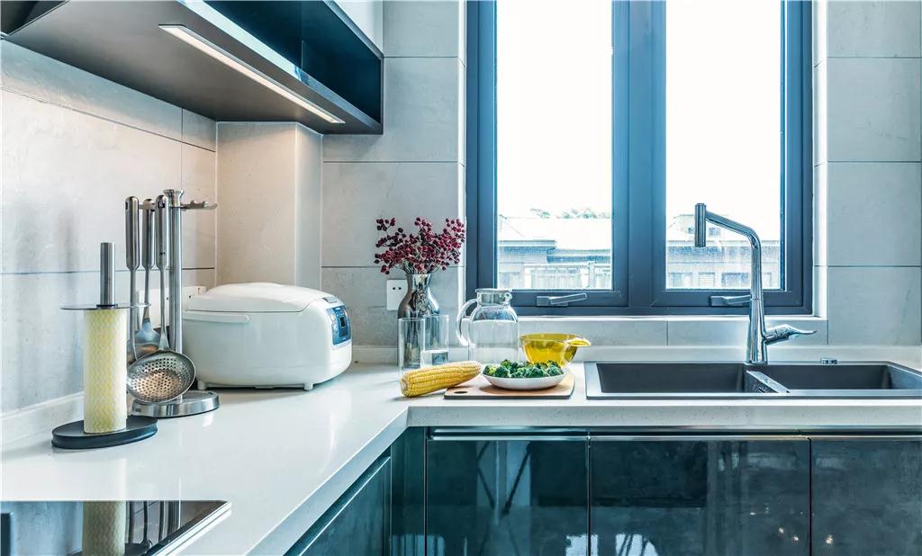 廚房采用了偏冷的色調(diào),白色的操作臺(tái)面搭配有序的廚具收納,營(yíng)造了清爽利落的烹飪格局。