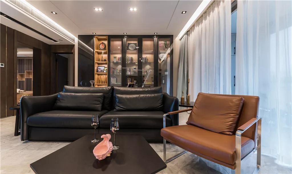 皮藝沙發(fā)以書(shū)房的玻璃書(shū)柜作背景,讓琳瑯滿(mǎn)目的擺件展示帶來(lái)高檔大方的韻味。