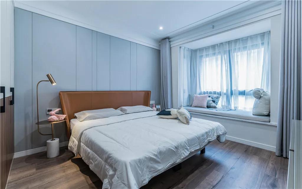 主臥床頭背景墻的淡藍(lán)色飾面板和窗簾,奠定了優(yōu)雅的藍(lán)色主調(diào)。