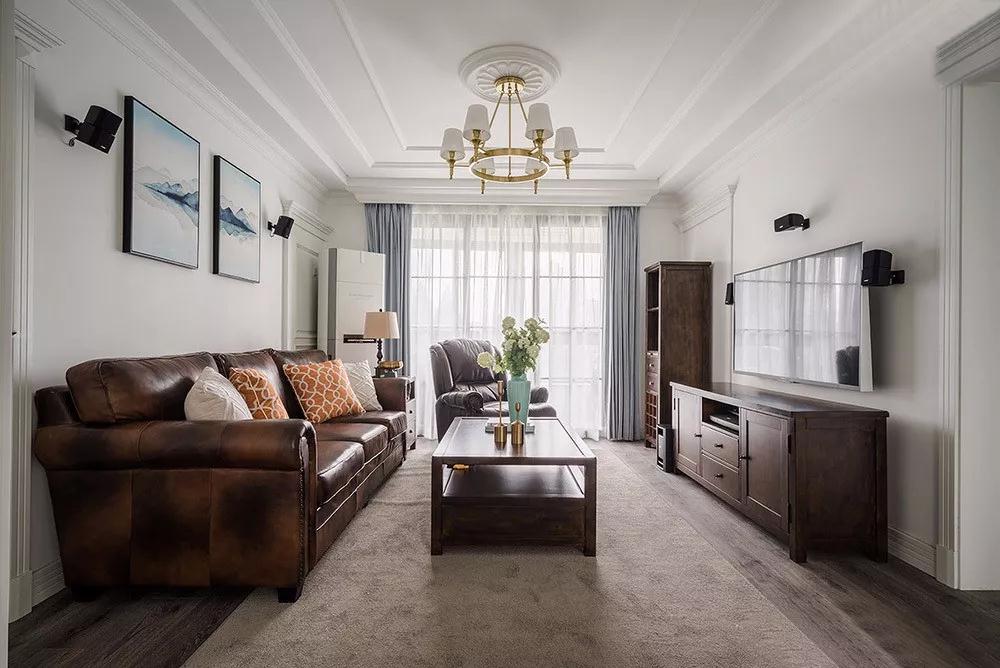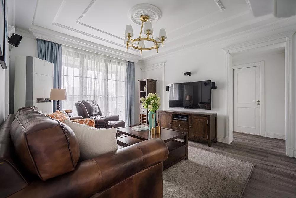 客廳在整體白調(diào)的基礎(chǔ)氛圍下,墻面和天花都做了精致的石膏造型?;?藍(lán)色的窗簾,給整個(gè)空間帶來一份安詳與潔凈。 深棕色皮質(zhì)沙發(fā)+鉚釘?shù)狞c(diǎn)綴,帶來了大方、典雅的氣質(zhì)。沙發(fā)墻上的裝飾畫增添一種意境的美感,起到點(diǎn)睛的作用
