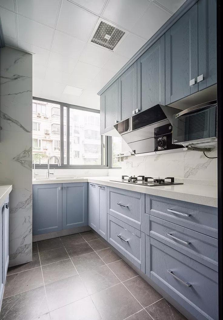 廚房區(qū)域運(yùn)用了爵士白的墻磚來點(diǎn)綴,帶動(dòng)了櫥柜的藍(lán)灰色面板,使整體的質(zhì)感得到了提升。