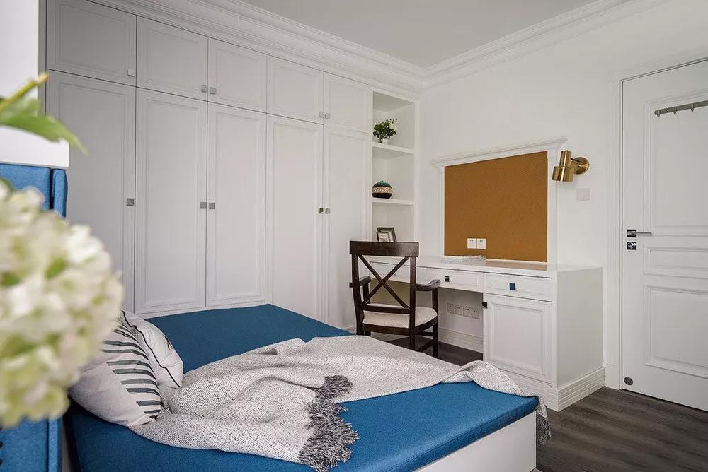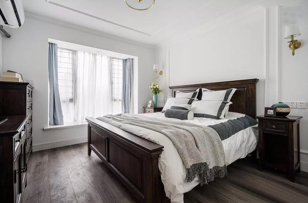主臥延續(xù)客廳的風(fēng)格,搭配深木色的實(shí)木床,結(jié)合美式的細(xì)節(jié)軟裝,整個(gè)臥室都沉浸在端莊柔和的氣息中。