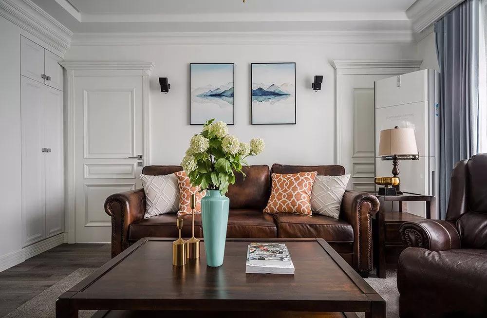 深棕色皮質(zhì)沙發(fā)+鉚釘?shù)狞c(diǎn)綴,帶來了大方、典雅的氣質(zhì)。沙發(fā)墻上的裝飾畫增添一種意境的美感,起到點(diǎn)睛的作用。