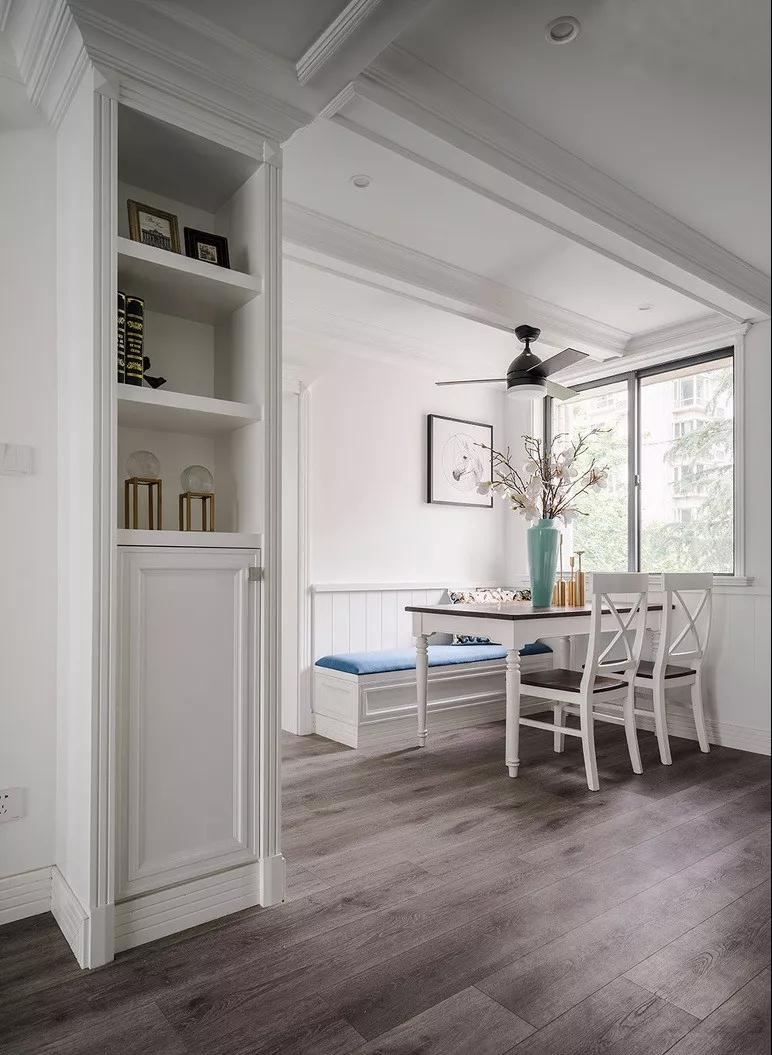 餐桌靠墻一側(cè)設(shè)計(jì)了一排帶儲(chǔ)物的卡座,增加儲(chǔ)物空間,同時(shí)使餐廳變得更加通透和寬敞。
