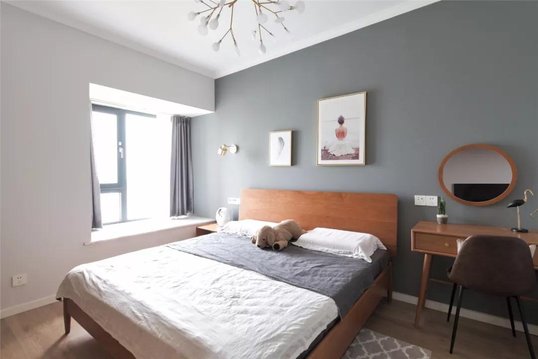 主臥,深色后退色墻面增加空間進深,選用木色的家具,以接近自然。床頭的掛畫和金屬壁燈,提升空間品位與格調。