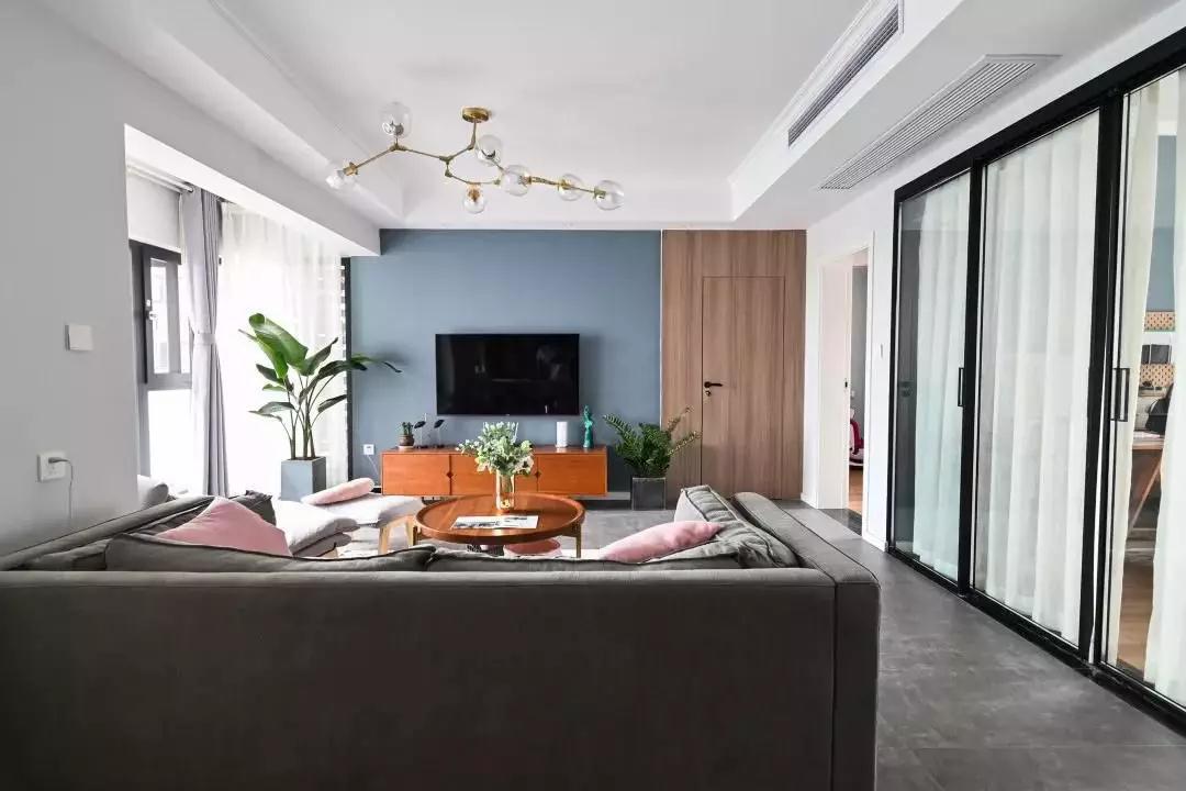 客廳電視墻以及餐廳都使用了灰藍色乳膠漆,整體統(tǒng)一協(xié)調,具有空間連貫性。