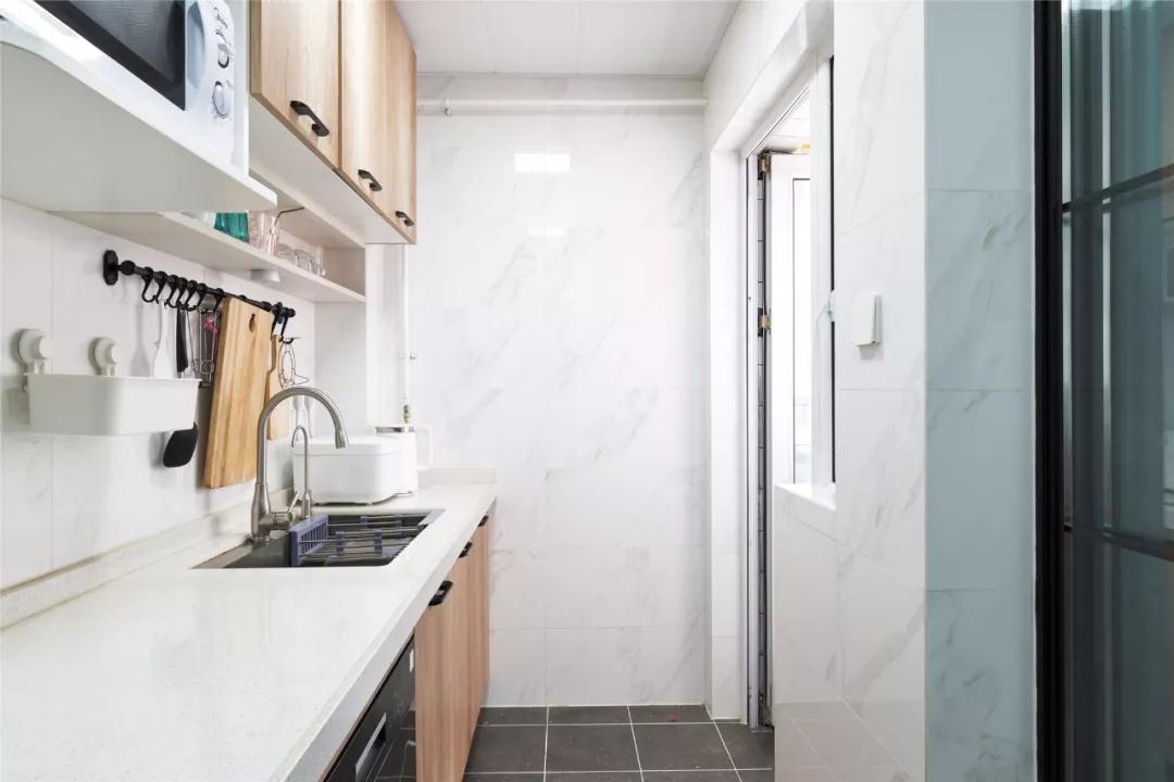 由于整體比較狹窄,采用了深色與白色墻磚做對比的方式,讓視覺上更為開闊。