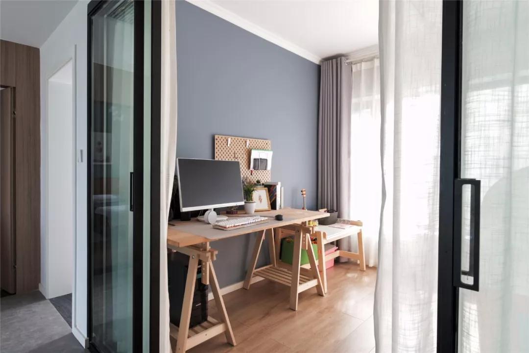 將一整面墻拆掉后,用黑框玻璃門加紗簾的組合,確保了辦公區(qū)域的隱私性,墻面顏色呼應了餐廳區(qū)域,更有連貫性。