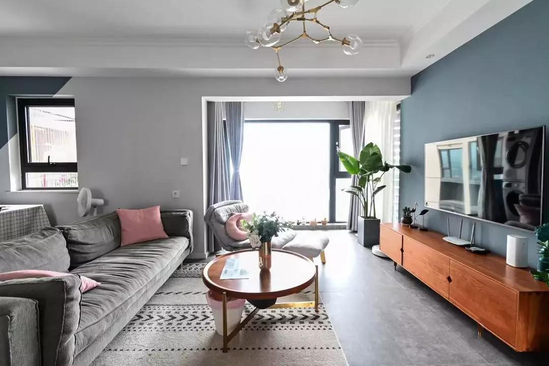 大橫廳的格局, 客廳網紅分子燈與餐廳金屬吊燈相呼應,簡約而舒適的灰色沙發(fā)點綴以粉色抱枕,簡單不失活潑。 幾何圖案的地毯,豐富了整個區(qū)域的視覺感受。 客廳電視墻 以及 餐廳 都使用了灰藍色乳膠漆,整體統(tǒng)一協(xié)調,具有空間
