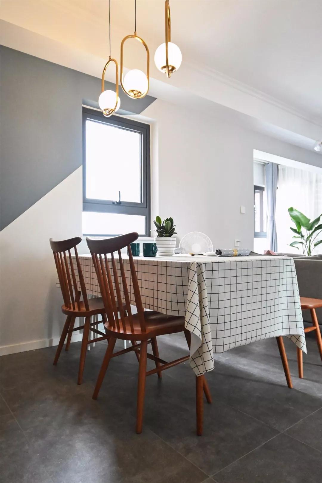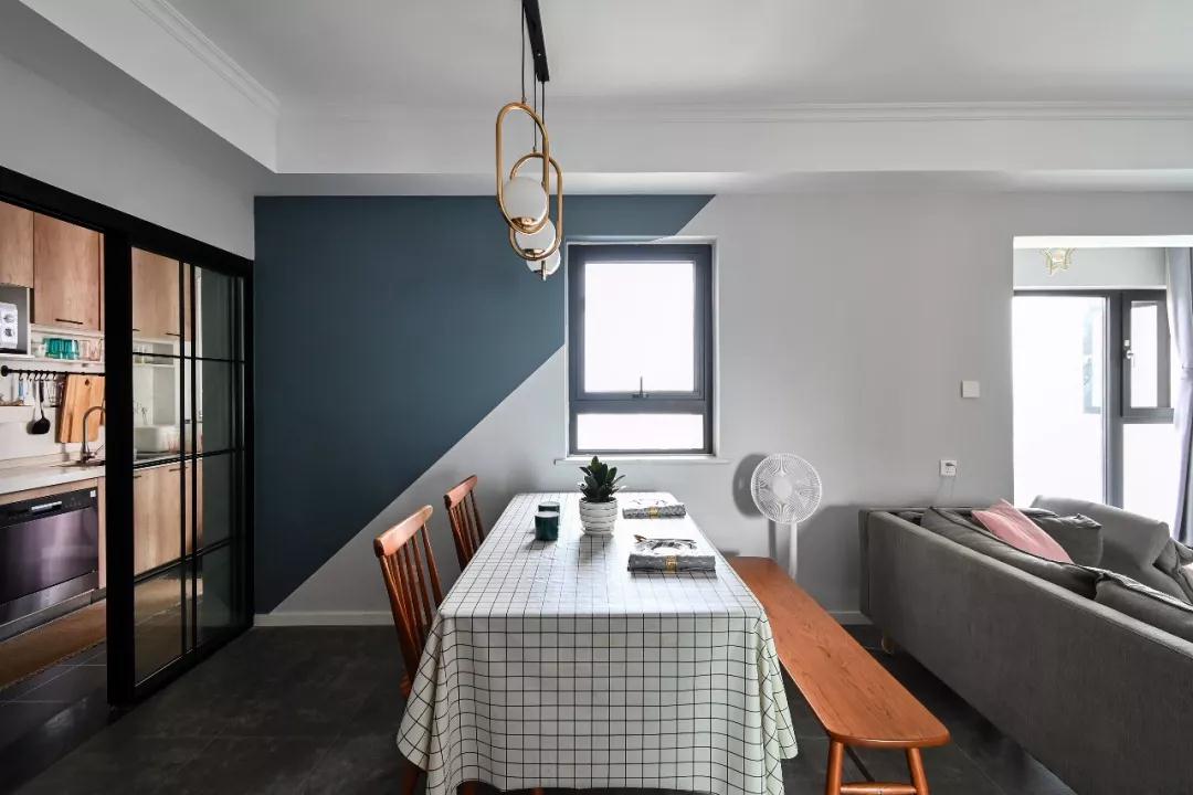餐廳,墻面顏色進行斜向的拼色處理,非常有造型感。長條形的餐桌搭配木質長板凳+網紅溫莎椅,營造出一個溫馨的就餐空間,同時可以容納更多客人聚餐使用