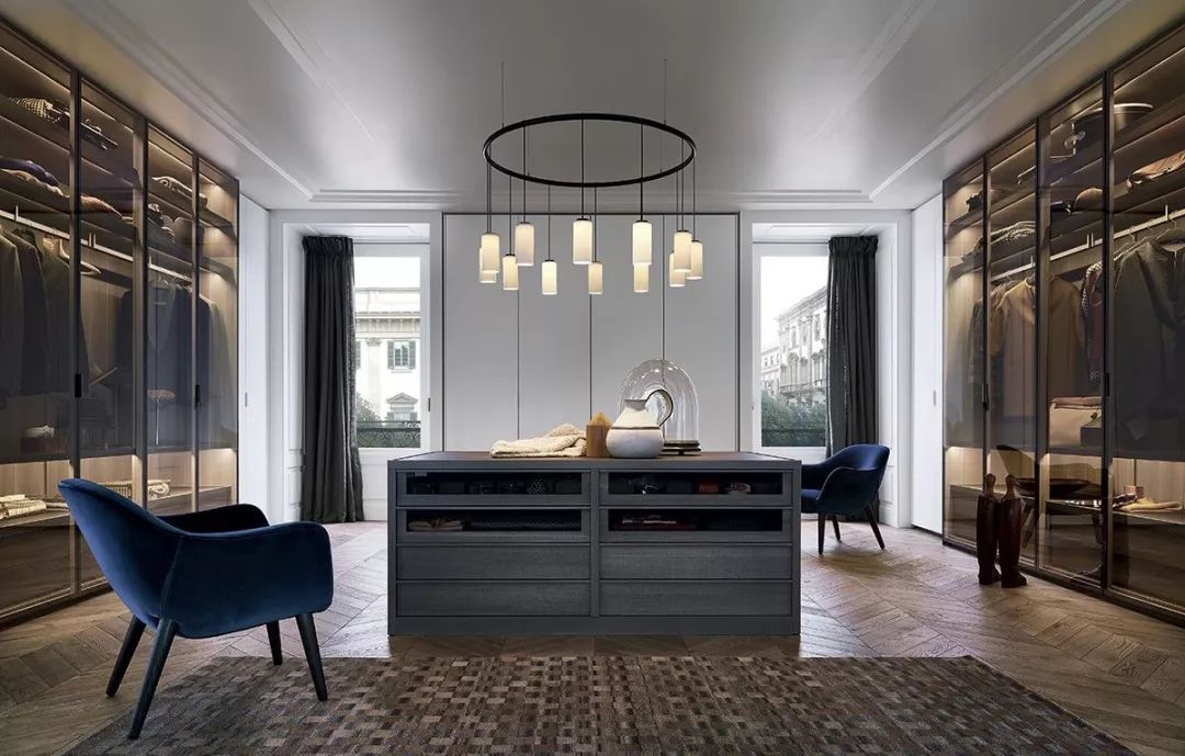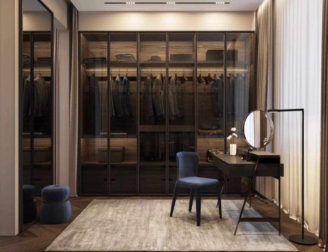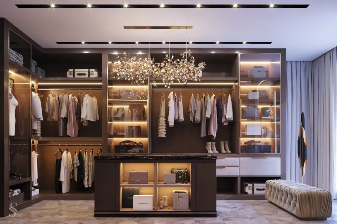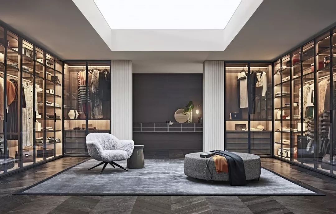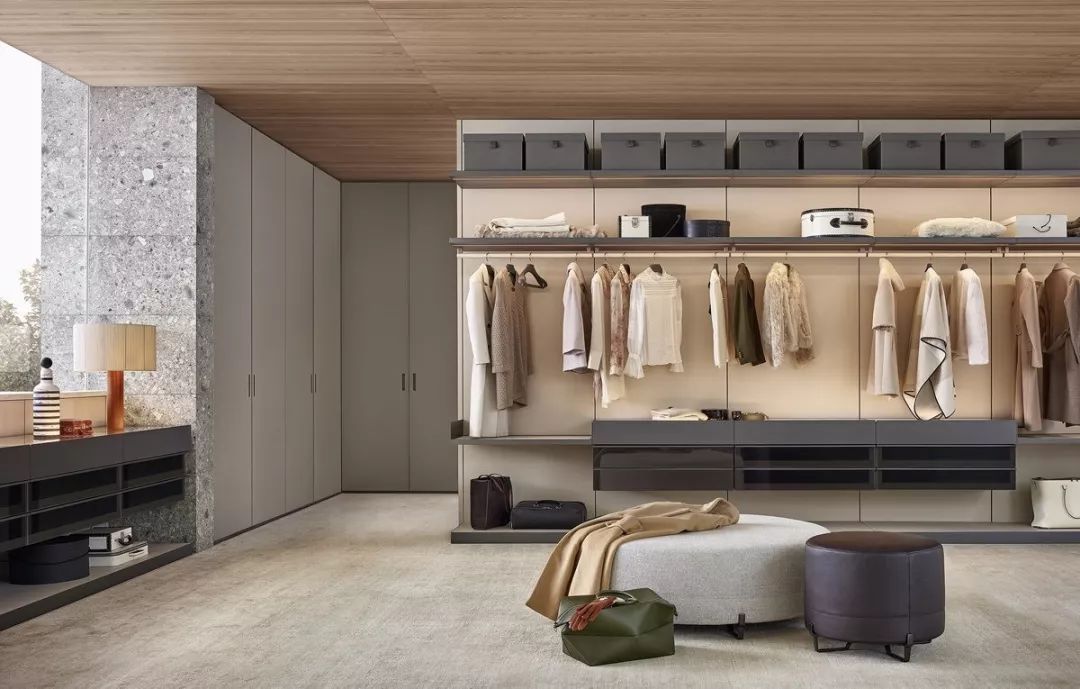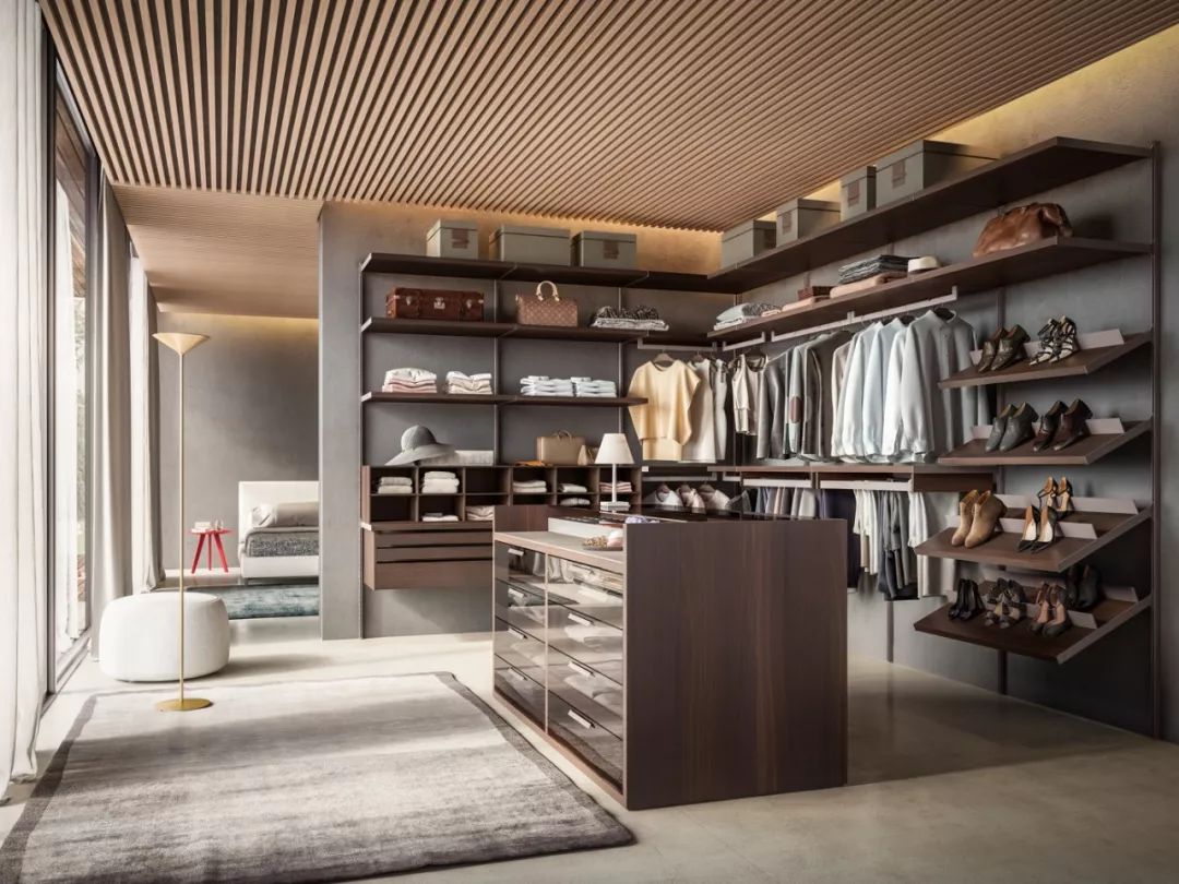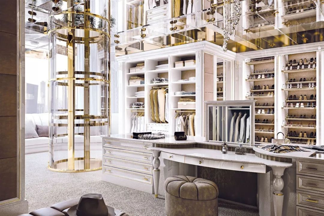 步入式衣柜起源于歐洲,與一般衣柜相比,其儲(chǔ)放空間更完整,衣物取用也更加便利。但因?yàn)樗粌H要有足夠的儲(chǔ)物空間,還要預(yù)留給使用者行走的通道,因此在豪宅中更為流行。