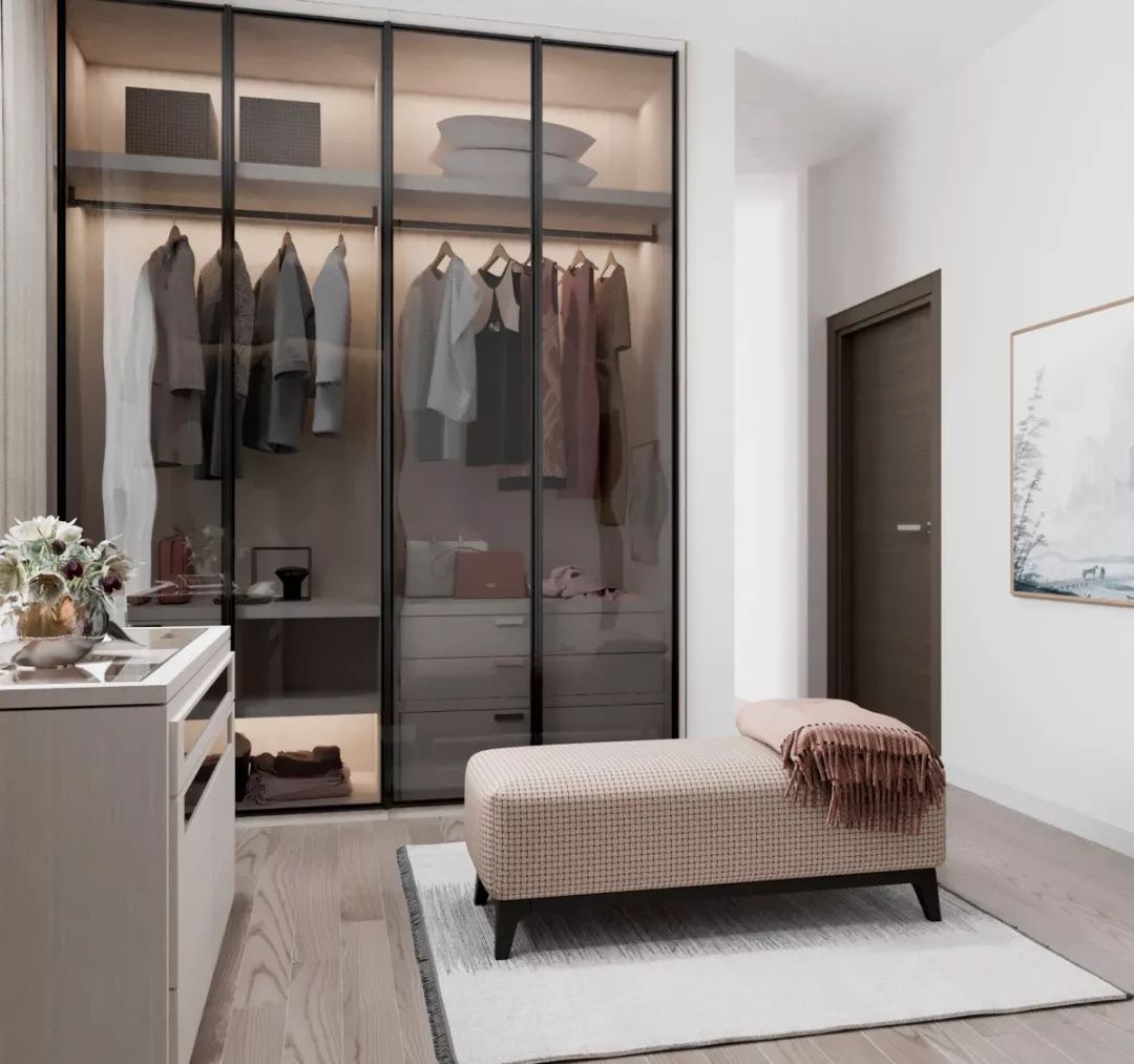 最后,在設(shè)計(jì)步入式衣柜時(shí),要先做好防潮處理,也可以在使用的時(shí)候放置一些防潮劑,這樣放置在衣帽間的衣物才不會(huì)受潮。