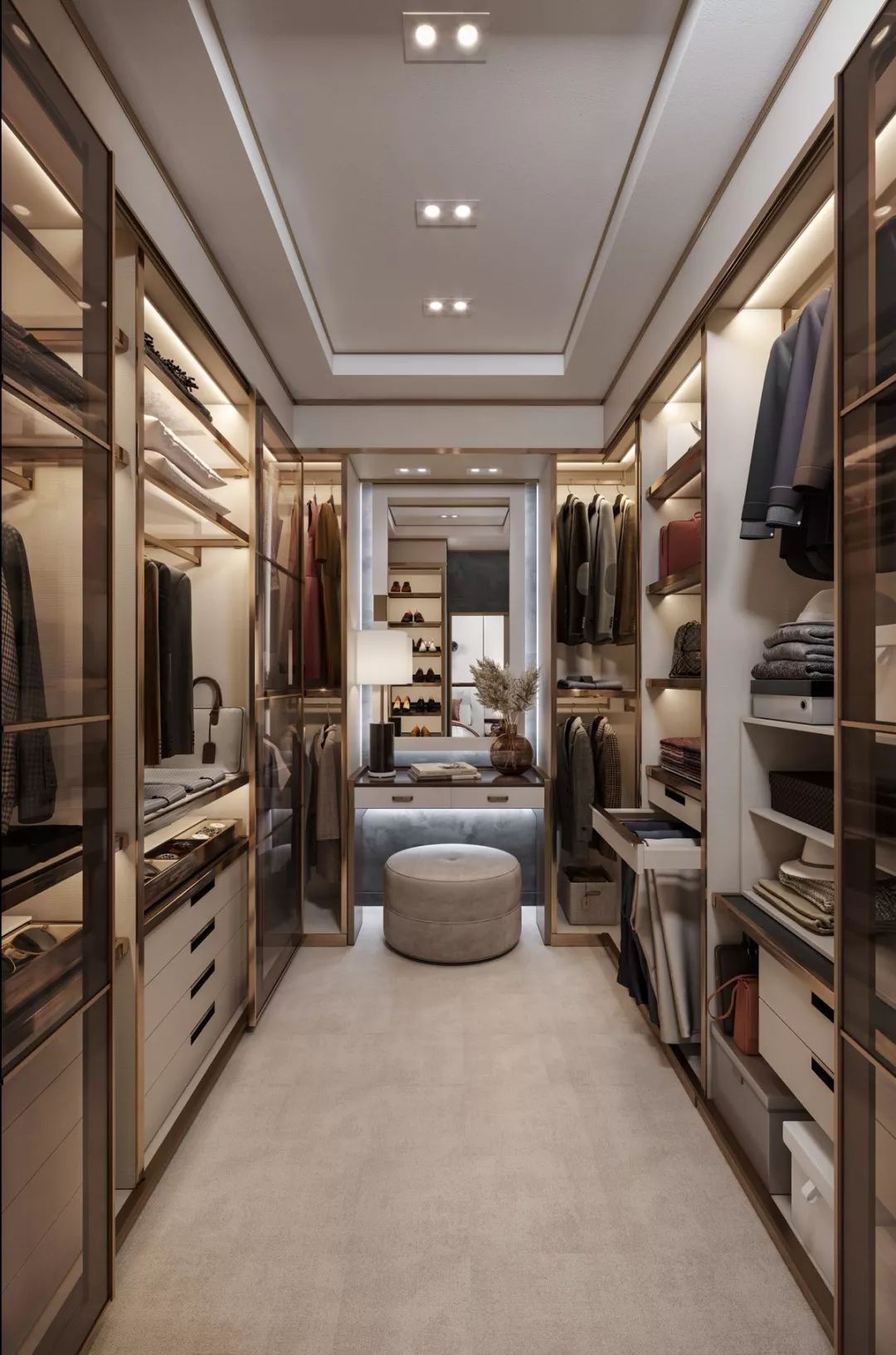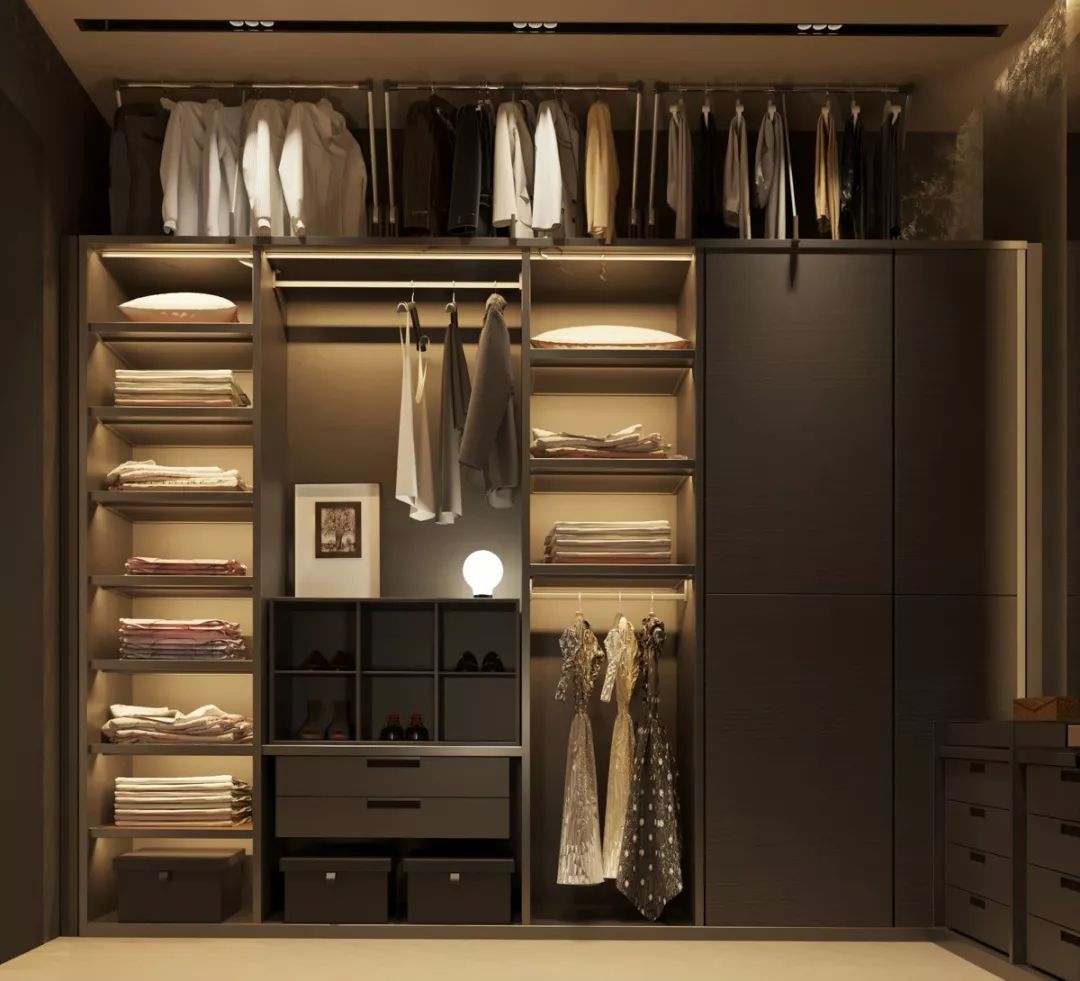 衣帽間的中層空間可以放置西裝、大衣、外套等,盡可能多預(yù)留出掛衣空間,并根據(jù)衣服的長短分上下橫桿吊掛。