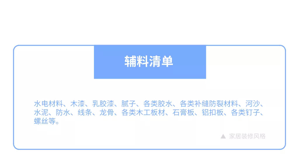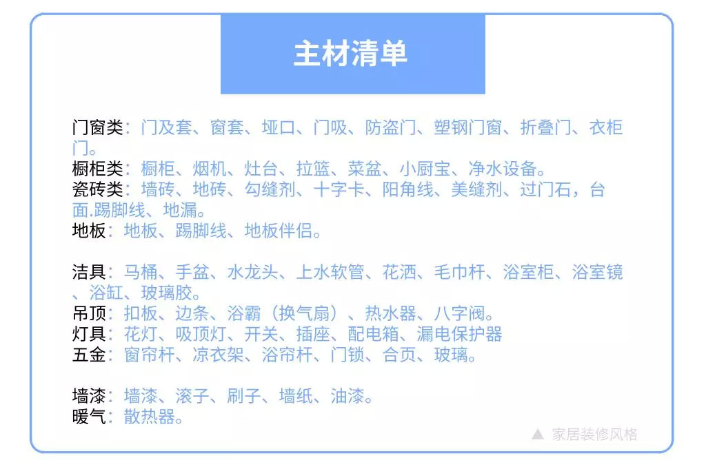 然后購(gòu)買主材、輔材(如下圖)和開(kāi)工前可購(gòu)買的材料,如地?zé)岵膳诩已b之前施工完畢;中央空調(diào)開(kāi)工之前最好能先定下;櫥柜在水電改造開(kāi)工前購(gòu)買;暖氣在設(shè)計(jì)方案確定后購(gòu)買。