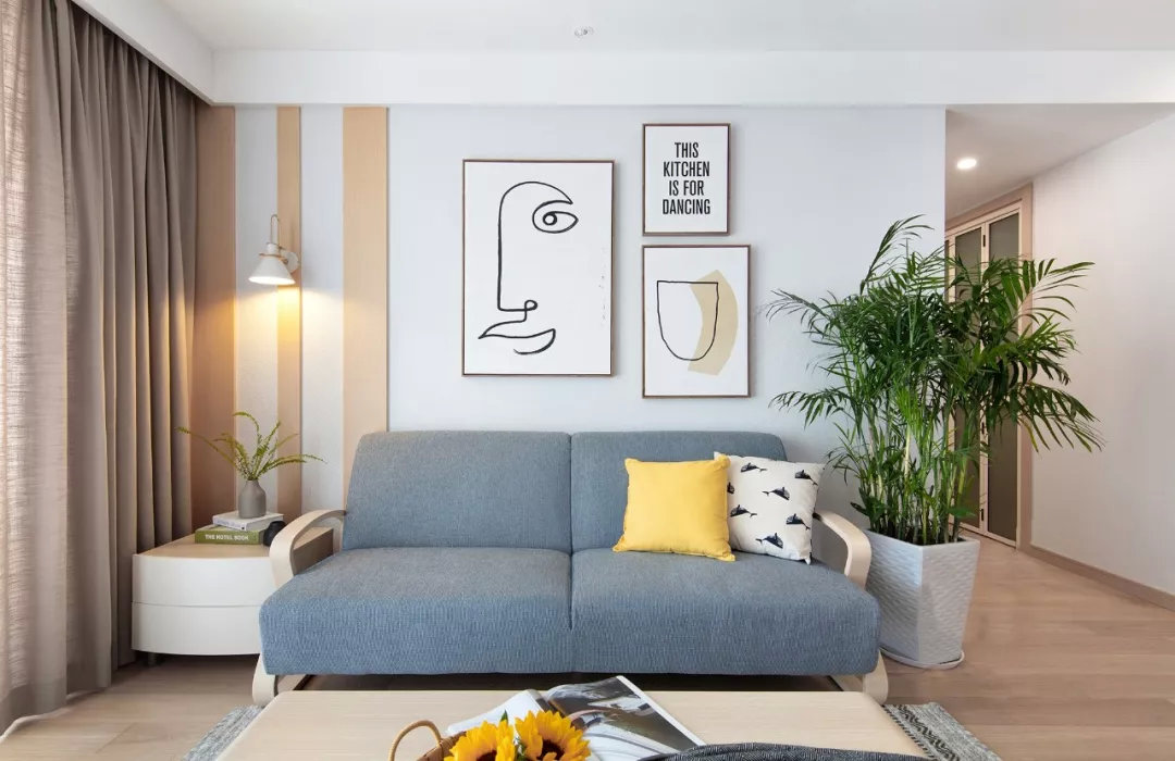 然后家具進(jìn)場(chǎng),做好軟裝搭配,布置好窗簾、窗簾桿、沙發(fā)、地毯、裝飾畫、植物盆栽等等。